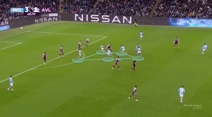 This is aided by the way they always remain close together in attack, ensuring that they can triangulate through short passes even within the bounds of tight defenses. So when they lose the ball, they already have five men ready to surround the ball carrier at any moment. This is even how Phil Foden scored that sweet left-footed goal against Villa recently, striking from distance within seconds of losing the ball himself.