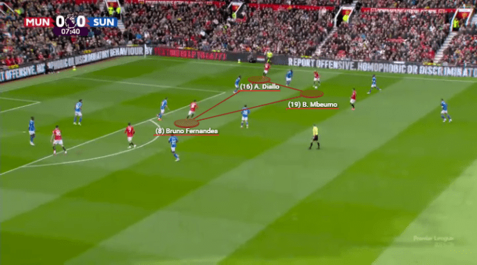 Bruno wants to be on his right foot. It’s where he feels most comfortable crossing the ball into the box and creating magic. And it’s where he naturally now has to gravitate as Mbeumo becomes the key outlet in behind.