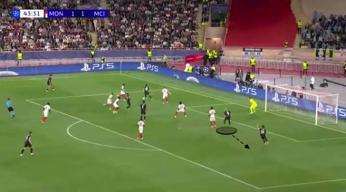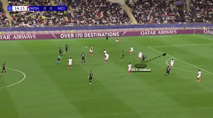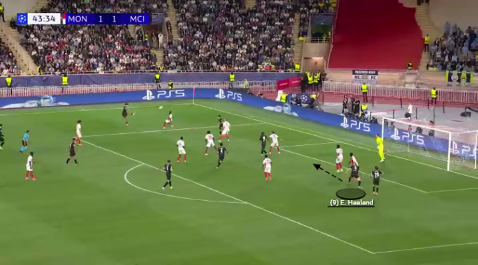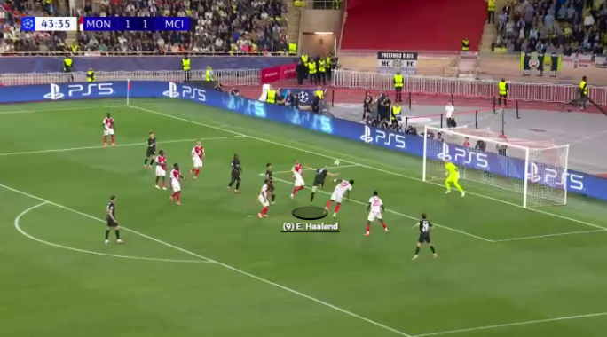 Here’s another example from a match against Monaco. The ball goes back to O’Reilly from inside the box. Haaland, like he’s in an LMFAO music video, shuffles backward.