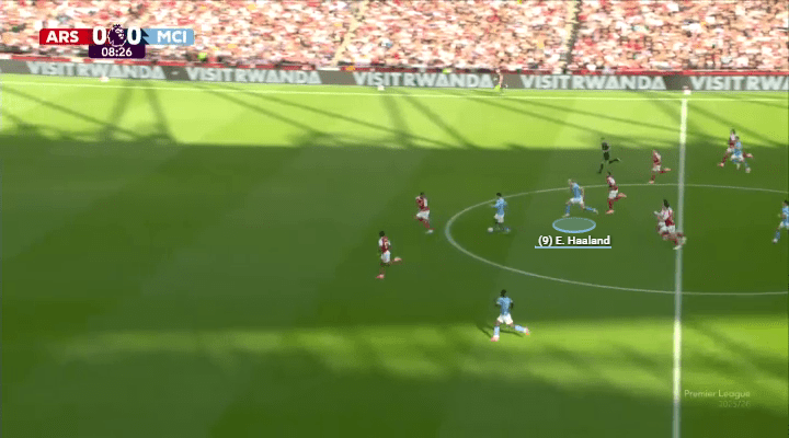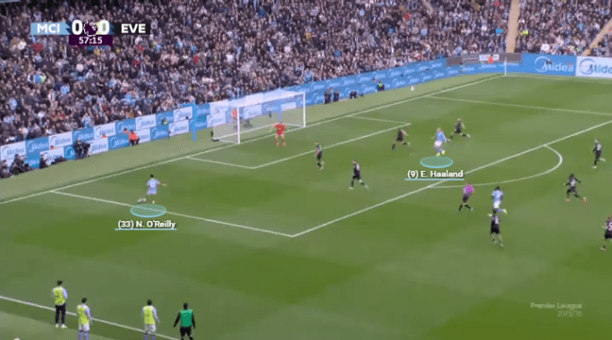 On this occasion, Idrissa Gueye sprints back. He’s got him in his sights. Haaland’s space to advance diminishes.
