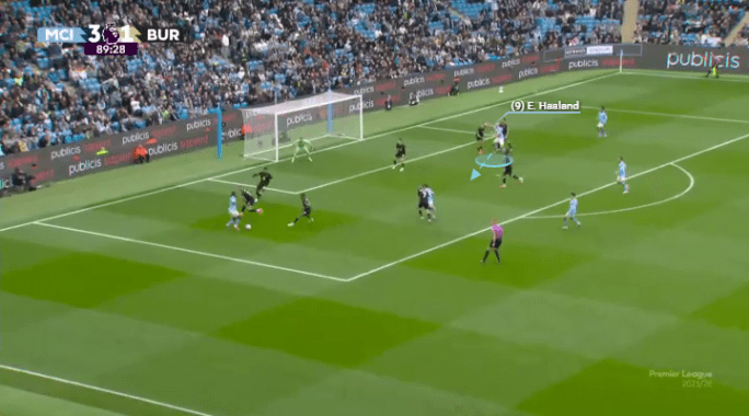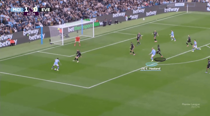 So as Savinho smartly delays and Gueye gets closer and closer, Haaland backsteps. You can even see him shift his body in the image above. Now when we move one second later, with that one little backwards step into the space vacated by Gueye, he’s created all the room he needs to finish.