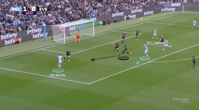 Idrissa Gueye, over-ambitious that Idrissa Gueye, now thinks I can handle both situations! He thinks he can shove Savinho into a 2v1, while screening a potential pass into the big Norwegian.