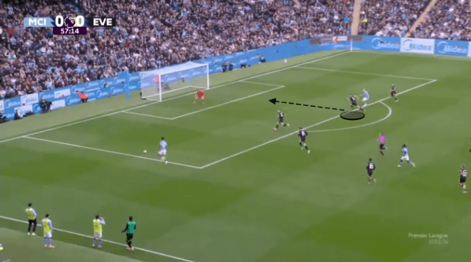For a defender, this is a nightmare! Notice how Michael Keane has to position his body. He thinks he’s in a footrace! Haaland must want to crash into the box at the back-post! Le Duh! That’s what any striker would do.