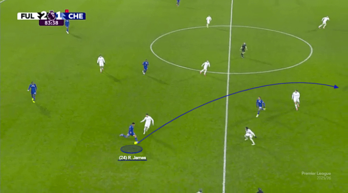 From the recent match against Fulham, we see a great example. Here’s James picking up the ball and being surrounded by players in white, without great options further forward.