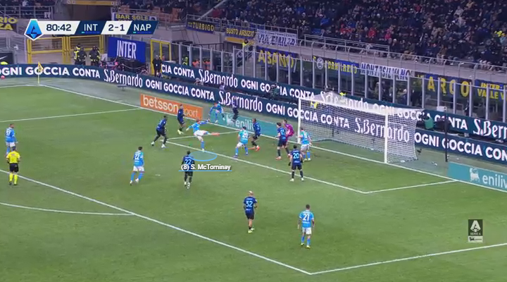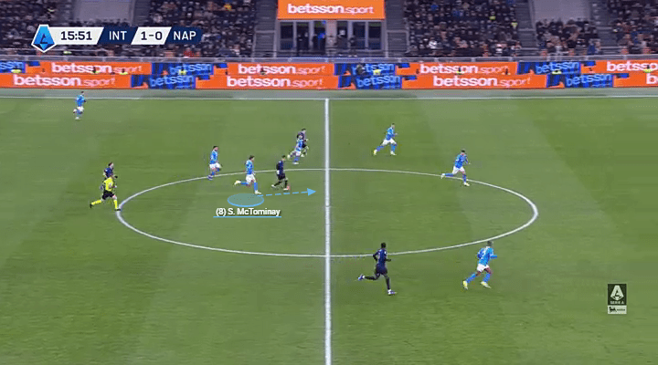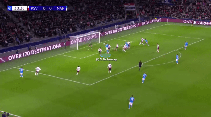 They also have several stars who command attention. Lukaku’s been replaced by another former United man in Rasmus Højlund. Kevin de Bruyne’s operating alongside him now and then. Frank Anguissa and David Neres can bulldoze their way forward. The full-backs in Leonardo Spinazzola and Giovanni di Lorenzo are brilliant ball players. There’s quality around the pitch. And still, they all want to find McTominay for that final touch.