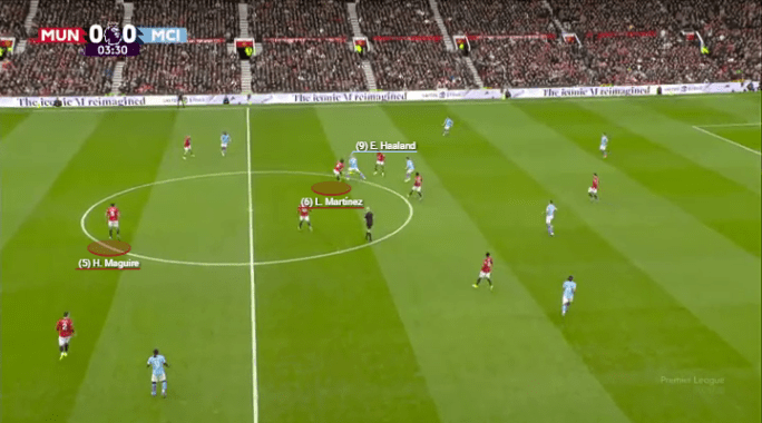 Martinez was active in stepping up whenever City tried to go direct into Haaland, and Maguire was dominant in the air, physical, and always in the right spot to cut out City’s centrality.