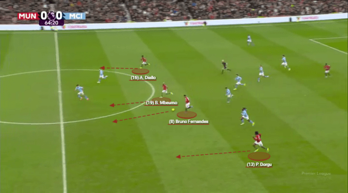 Embed from Getty ImagesSo right off the bat, this was the best possible trio that United could use to screen passes into Haaland. They made it impossible for the Sky Blues to find Haaland, and then bravely defended with numbers around the ball whenever the big Norwegian picked up possession.