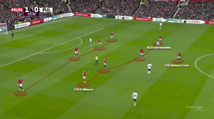 When Cunha found himself laboured after a bursting run through the middle, Fernandes would slot in to cover the potential open space down the left. Mbeumo sometimes filled in on the right for an out of position Amad Diallo. This camaraderie and togetherness ultimately kept United in a commanding lead of the game up until the 75th minute.