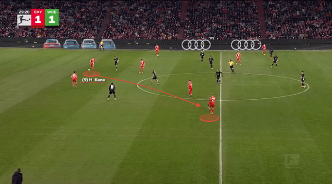 Here’s an example where Kane drops all the way to the position of a centre-back(!) to pick up possession and build those beginning blocks for Bayern.
