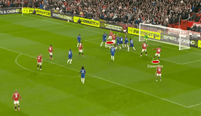 Fernandes floats the ball up toward an unmarked Maguire. As the ball travels toward Maguire, Casemiro’s already ready to curve a run toward the back-post. Maguire knows exactly where to put the ball.