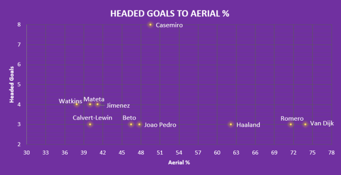 It was his eighth headed goal of the campaign. That’s double the amount of anyone else in the league, with strikers Raul Jimenez, Jean-Philippe Mateta and Ollie Watkins behind him on four each.