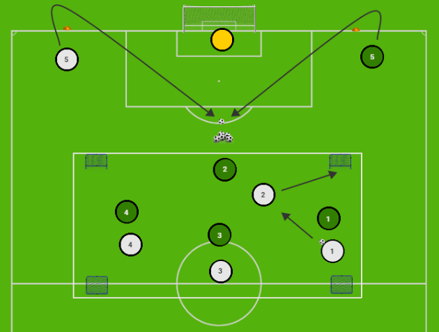 I've never been a big fan of shooting & finishing session plans, as they often involve activities with loads of wait time, and take up too much time for something that happens actually relatively infrequently in games. Instead, I've preferred to work on shooting & finishing with players in 1on1 or small-group training sessions, where the repetition can still be high and the waiting time low. That said, players love shooting & finishing sessions. Who doesn't like to shoot the ball and score goals? All players enjoy these sessions, even goalkeepers and defenders as it means they get opportunities to do what they love too. So with that, here is a variety of shooting & finishing activities to help you design your own shooting & finishing session with individuals or groups. The activities are separated between the amount of repetition and wait time, helping you make a distinction between which might be useful for smaller numbers and which can be done in team training.
